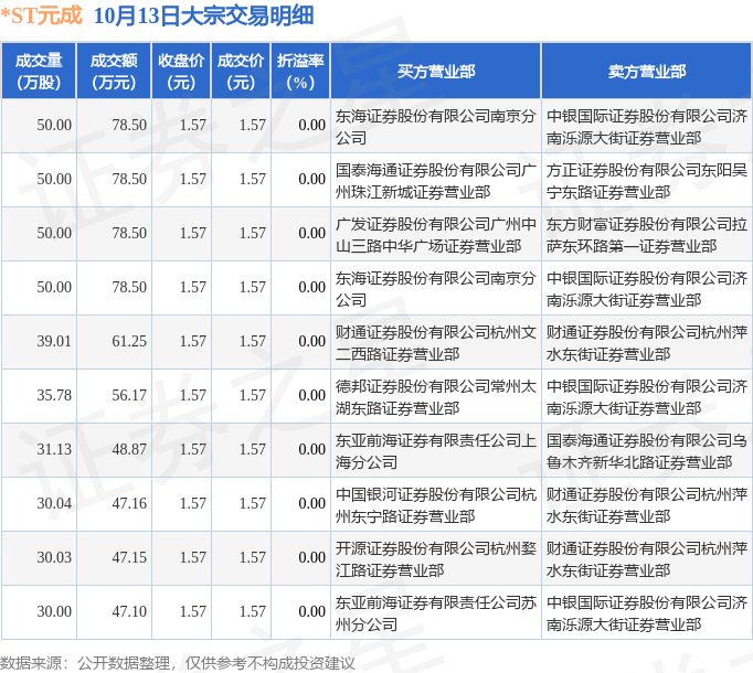 证券之星消息,10月13日*ST元成发生大宗交易,交易数据如下: