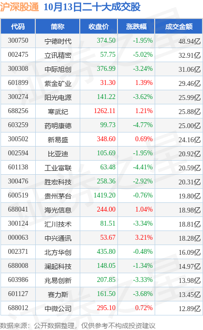 当日北向资金余额额度充足,宝泰隆(601011)领涨,涨幅10.09%,交易所公布的沪深股通二十大成交股中成交额前三的为宁德时代、立讯精密、中际旭创,成交额分别为48.94亿元、32.91亿元、31.06亿元。详情可见下表: