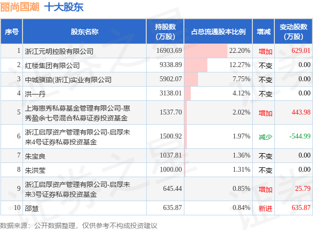 证券之星消息,10月13日丽尚国潮发布公告《丽尚国潮:丽尚国潮关于控股股东权益变动触及1%刻度的提示性公告》,其股东浙江元明控股有限公司于2025年5月13日至2025年10月13日间合计增持686.94万股,占公司目前总股本的0.9023%,变动期间该股股价上涨1.02%,截止10月13日收盘报4.97元。