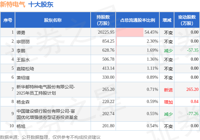 证券之星消息,10月13日新特电气发布公告《新特电气:关于控股股东、实际控制人及其一致行动人持股比例变动触及1%整数倍的公告》,其股东宗丽丽、李淑芹于2025年9月3日至2025年10月10日间合计减持219.12万股,占公司目前总股本的0.5899%,变动期间该股股价上涨26.98%,截止10月10日收盘报17.98元。