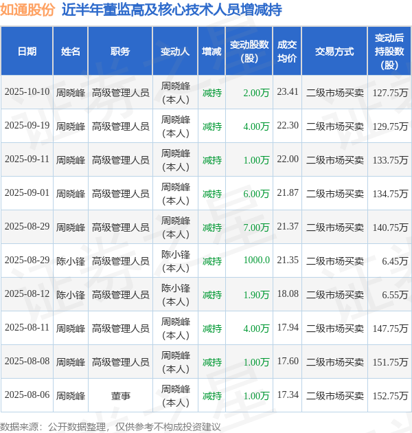 如通股份近半年内的董监高及核心技术人员增减持详情如下: