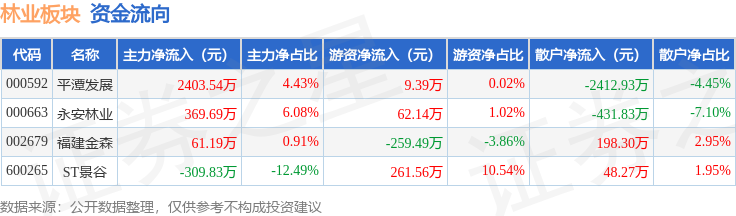 从资金流向上来看,当日林业板块主力资金净流入2524.59万元,游资资金净流入73.59万元,散户资金净流出2598.19万元。林业板块个股资金流向见下表: