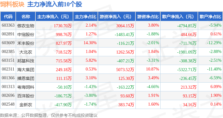 从资金流向上来看,当日饲料板块主力资金净流出5040.52万元,游资资金净流入1.34亿元,散户资金净流出8406.68万元。饲料板块个股资金流向见下表: