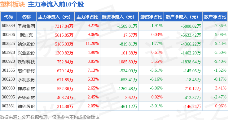 从资金流向上来看,当日塑料板块主力资金净流出3.72亿元,游资资金净流出9677.1万元,散户资金净流入4.69亿元。塑料板块个股资金流向见下表: