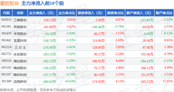 从资金流向上来看,当日橡胶板块主力资金净流出1.63亿元,游资资金净流入1.27亿元,散户资金净流入3581.84万元。橡胶板块个股资金流向见下表: