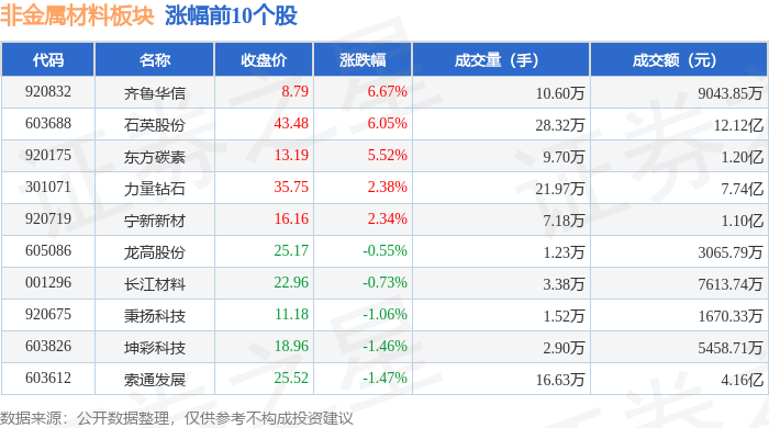证券之星消息,10月13日非金属材料板块较上一交易日上涨0.52%,齐鲁华信领涨。当日上证指数报收于3889.5,下跌0.19%。深证成指报收于13231.47,下跌0.93%。非金属材料板块个股涨跌见下表: