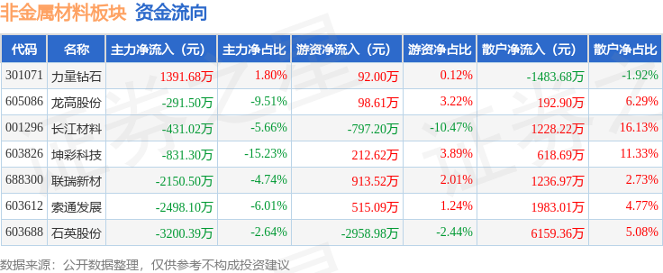 从资金流向上来看,当日非金属材料板块主力资金净流出8011.14万元,游资资金净流出1924.34万元,散户资金净流入9935.48万元。非金属材料板块个股资金流向见下表: