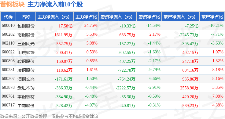 从资金流向上来看,当日普钢板块主力资金净流入14.7亿元,游资资金净流出11.38亿元,散户资金净流出3.32亿元。普钢板块个股资金流向见下表: