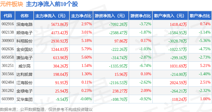 从资金流向上来看,当日元件板块主力资金净流出26.28亿元,游资资金净流入7412.96万元,散户资金净流入25.54亿元。元件板块个股资金流向见下表: