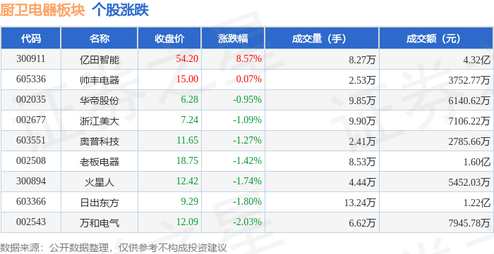 证券之星消息,10月13日厨卫电器板块较上一交易日下跌0.05%,万和电气领跌。当日上证指数报收于3889.5,下跌0.19%。深证成指报收于13231.47,下跌0.93%。厨卫电器板块个股涨跌见下表: