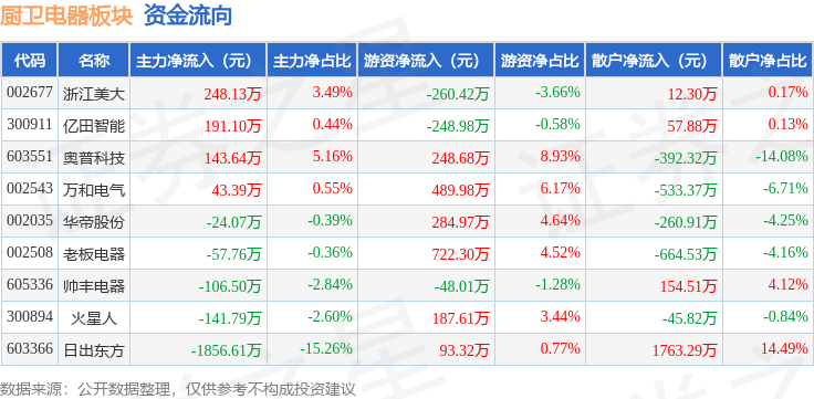 从资金流向上来看,当日厨卫电器板块主力资金净流出1560.47万元,游资资金净流入1469.44万元,散户资金净流入91.03万元。厨卫电器板块个股资金流向见下表: