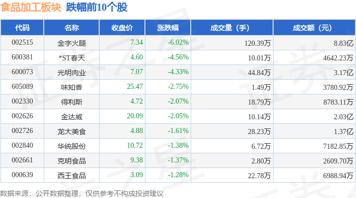 证券之星消息,10月13日食品加工板块较上一交易日下跌1.0%,金字火腿领跌。当日上证指数报收于3889.5,下跌0.19%。深证成指报收于13231.47,下跌0.93%。食品加工板块个股涨跌见下表: