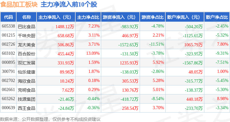 从资金流向上来看,当日食品加工板块主力资金净流出1.49亿元,游资资金净流入1.34亿元,散户资金净流入1551.22万元。食品加工板块个股资金流向见下表:
