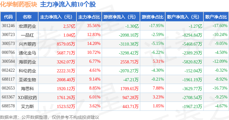 从资金流向上来看,当日化学制药板块主力资金净流出6.11亿元,游资资金净流入9653.97万元,散户资金净流入5.15亿元。化学制药板块个股资金流向见下表:
