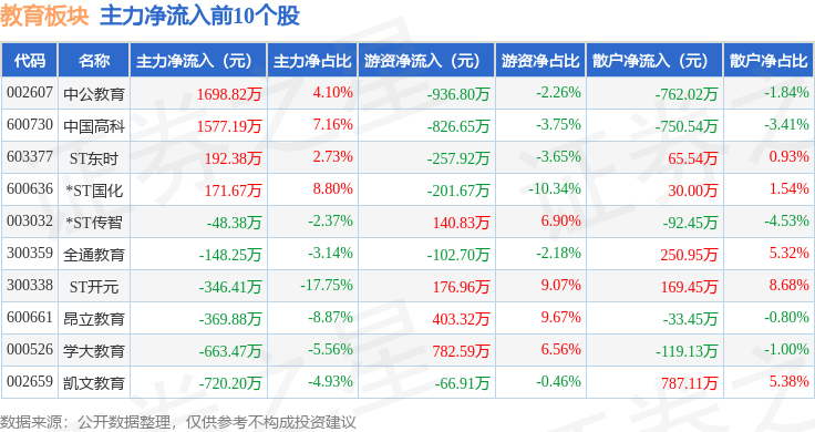 从资金流向上来看,当日教育板块主力资金净流出1.26亿元,游资资金净流入1008.21万元,散户资金净流入1.16亿元。教育板块个股资金流向见下表:
