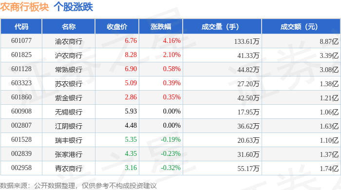证券之星消息,10月13日农商行板块较上一交易日上涨2.42%,渝农商行领涨。当日上证指数报收于3889.5,下跌0.19%。深证成指报收于13231.47,下跌0.93%。农商行板块个股涨跌见下表: