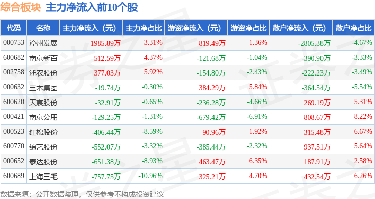 从资金流向上来看,当日综合板块主力资金净流出1.57亿元,游资资金净流入5820.67万元,散户资金净流入9883.94万元。综合板块个股资金流向见下表: