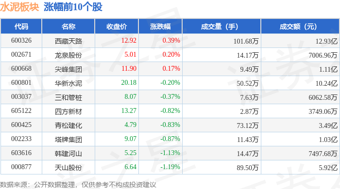 证券之星消息,10月13日水泥板块较上一交易日下跌1.2%,上峰水泥领跌。当日上证指数报收于3889.5,下跌0.19%。深证成指报收于13231.47,下跌0.93%。水泥板块个股涨跌见下表: