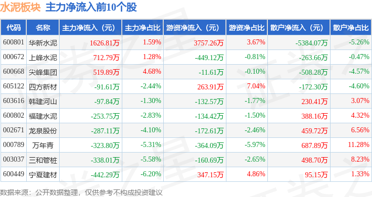 从资金流向上来看,当日水泥板块主力资金净流出2.92亿元,游资资金净流入2169.85万元,散户资金净流入2.7亿元。水泥板块个股资金流向见下表: