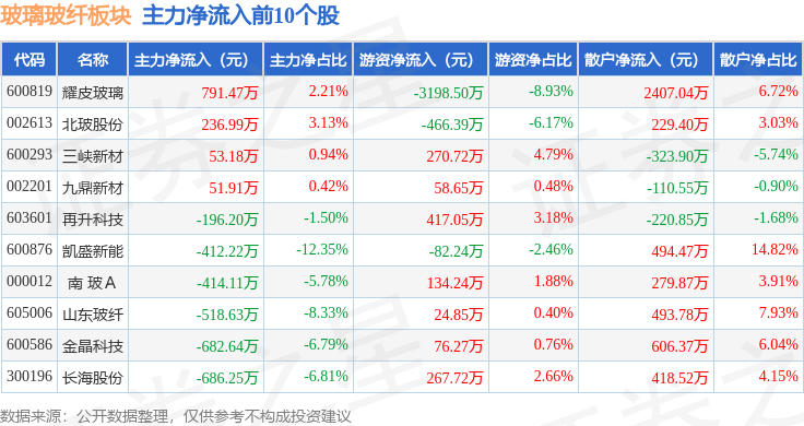 从资金流向上来看,当日玻璃玻纤板块主力资金净流出2.91亿元,游资资金净流出1.35亿元,散户资金净流入4.26亿元。玻璃玻纤板块个股资金流向见下表: