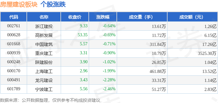 证券之星消息,10月13日房屋建设板块较上一交易日下跌0.9%,宁波建工领跌。当日上证指数报收于3889.5,下跌0.19%。深证成指报收于13231.47,下跌0.93%。房屋建设板块个股涨跌见下表: