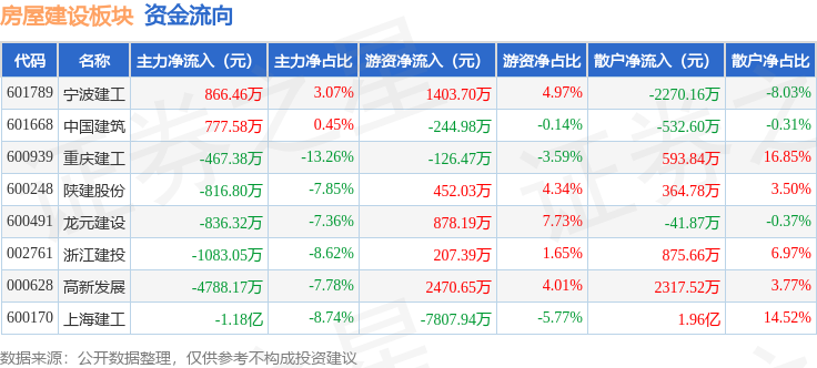 从资金流向上来看,当日房屋建设板块主力资金净流出1.82亿元,游资资金净流出2767.42万元,散户资金净流入2.09亿元。房屋建设板块个股资金流向见下表: