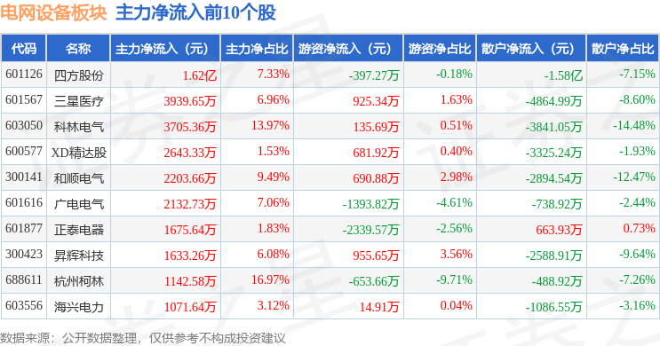 从资金流向上来看,当日电网设备板块主力资金净流出14.47亿元,游资资金净流入3.06亿元,散户资金净流入11.41亿元。电网设备板块个股资金流向见下表: