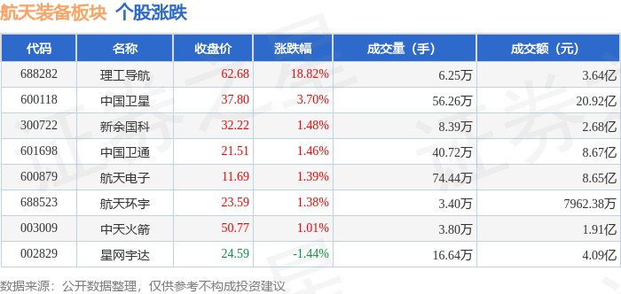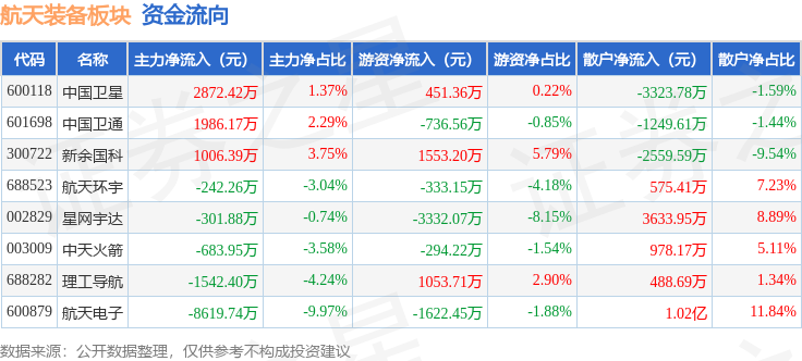 从资金流向上来看,当日航天装备板块主力资金净流出5525.24万元,游资资金净流出3260.18万元,散户资金净流入8785.42万元。航天装备板块个股资金流向见下表: