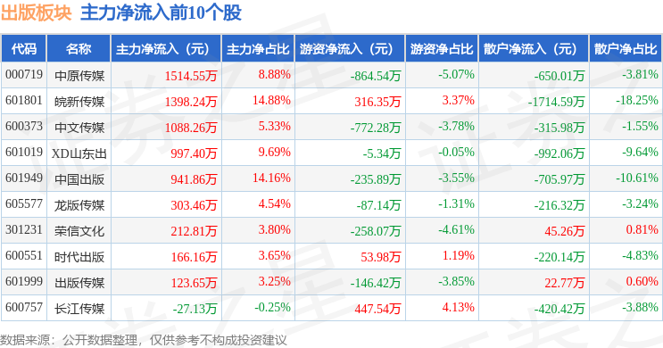 从资金流向上来看,当日出版板块主力资金净流出1.44亿元,游资资金净流入2566.97万元,散户资金净流入1.18亿元。出版板块个股资金流向见下表: