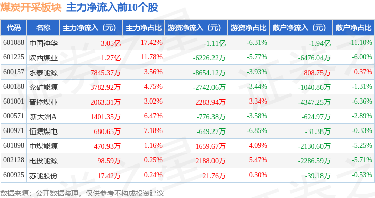 从资金流向上来看,当日煤炭开采板块主力资金净流入3.28亿元,游资资金净流出1.67亿元,散户资金净流出1.61亿元。煤炭开采板块个股资金流向见下表: