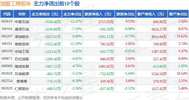 从资金流向上来看,当日油服工程板块主力资金净流出1.75亿元,游资资金净流入4413.82万元,散户资金净流入1.31亿元。油服工程板块个股资金流向见下表:
