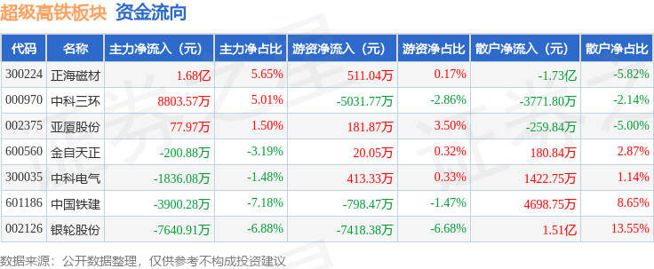 从资金流向上来看,当日超级高铁板块主力资金净流入1.21亿元,游资资金净流出1.21亿元,散户资金净流入28.82万元。超级高铁板块个股资金流向见下表:
