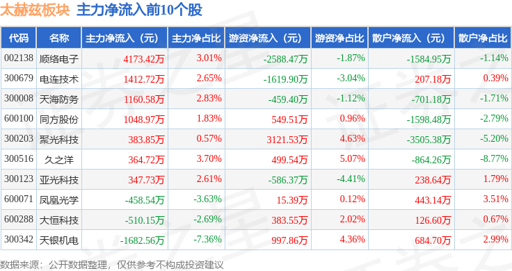 从资金流向上来看,当日太赫兹板块主力资金净流出8.04亿元,游资资金净流出836.76万元,散户资金净流入8.12亿元。太赫兹板块个股资金流向见下表: