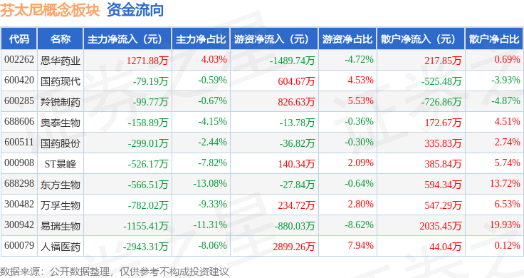 从资金流向上来看,当日芬太尼概念板块主力资金净流出5338.4万元,游资资金净流入2257.42万元,散户资金净流入3080.98万元。芬太尼概念板块个股资金流向见下表: