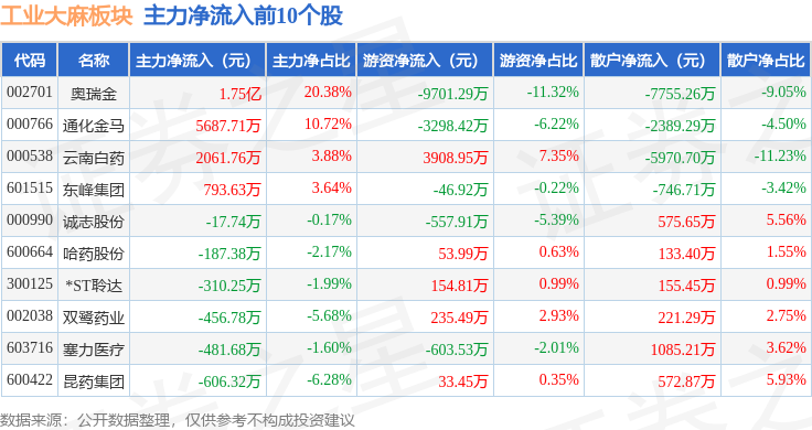 从资金流向上来看,当日工业大麻板块主力资金净流出2498.61万元,游资资金净流出3541.78万元,散户资金净流入6040.39万元。工业大麻板块个股资金流向见下表: