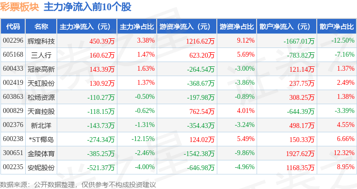 从资金流向上来看,当日彩票板块主力资金净流出1.49亿元,游资资金净流入1547.25万元,散户资金净流入1.34亿元。彩票板块个股资金流向见下表: