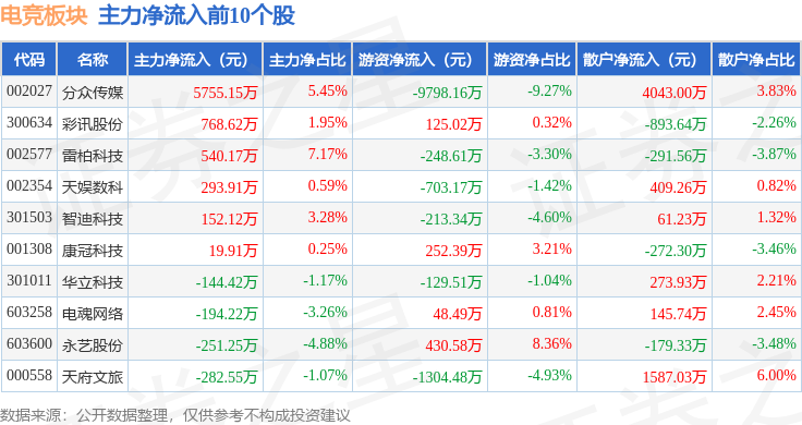 从资金流向上来看,当日电竞板块主力资金净流出5.58亿元,游资资金净流入497.04万元,散户资金净流入5.53亿元。电竞板块个股资金流向见下表: