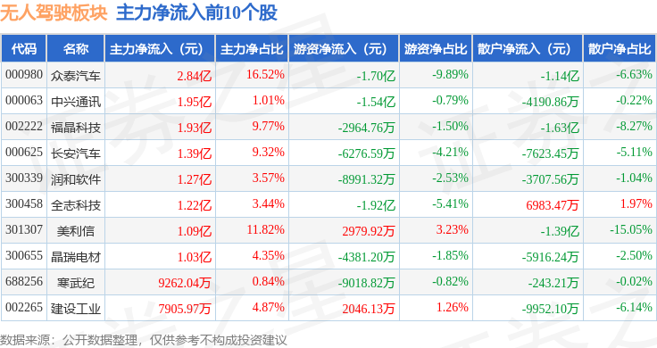 从资金流向上来看,当日无人驾驶板块主力资金净流出71.41亿元,游资资金净流入14.19亿元,散户资金净流入57.22亿元。无人驾驶板块个股资金流向见下表: