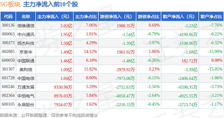 从资金流向上来看,当日5G板块主力资金净流出70.89亿元,游资资金净流入1.52亿元,散户资金净流入69.37亿元。5G板块个股资金流向见下表: