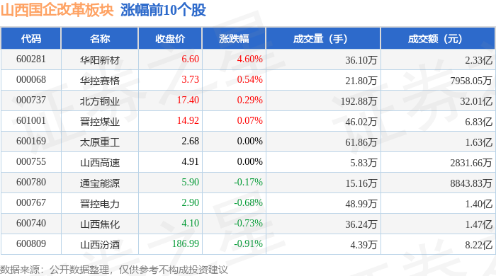 证券之星消息,10月13日山西国企改革板块较上一交易日下跌0.93%,国新能源领跌。当日上证指数报收于3889.5,下跌0.19%。深证成指报收于13231.47,下跌0.93%。山西国企改革板块个股涨跌见下表: