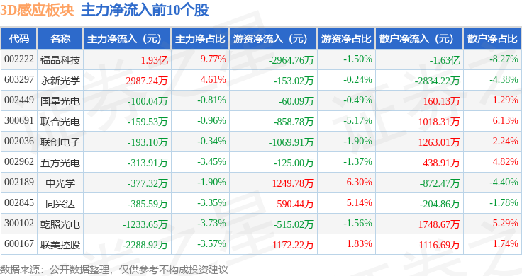 从资金流向上来看,当日3D感应板块主力资金净流出15.41亿元,游资资金净流入2395.88万元,散户资金净流入15.17亿元。3D感应板块个股资金流向见下表: