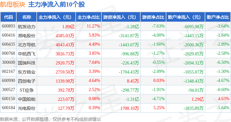 从资金流向上来看,当日航母板块主力资金净流出3574.17万元,游资资金净流出3.37亿元,散户资金净流入3.73亿元。航母板块个股资金流向见下表: