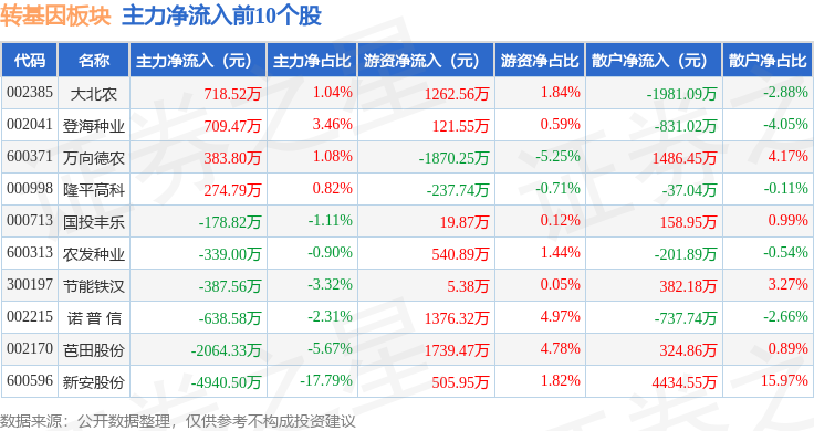 从资金流向上来看,当日转基因板块主力资金净流出1.28亿元,游资资金净流入8267.46万元,散户资金净流入4551.82万元。转基因板块个股资金流向见下表: