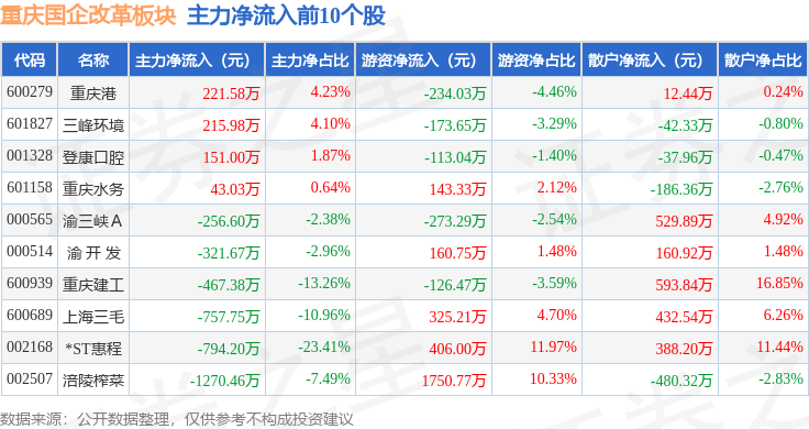 从资金流向上来看,当日重庆国企改革板块主力资金净流出2.2亿元,游资资金净流入1.33亿元,散户资金净流入8661.82万元。重庆国企改革板块个股资金流向见下表: