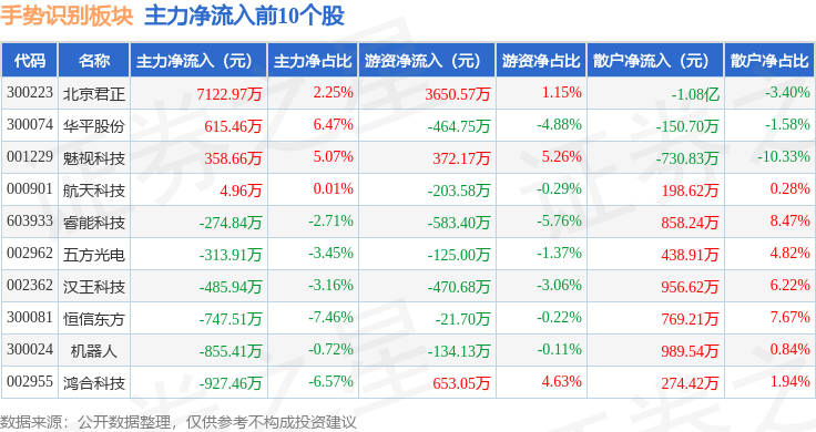 从资金流向上来看,当日手势识别板块主力资金净流出2.15亿元,游资资金净流入8387.39万元,散户资金净流入1.31亿元。手势识别板块个股资金流向见下表: