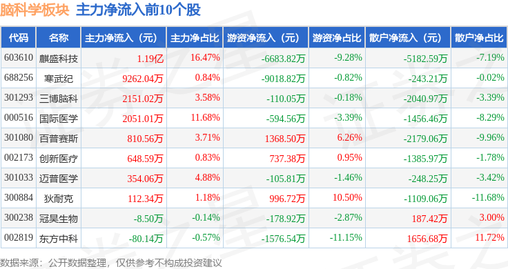 从资金流向上来看,当日脑科学板块主力资金净流出9.43亿元,游资资金净流入1504.24万元,散户资金净流入9.28亿元。脑科学板块个股资金流向见下表: