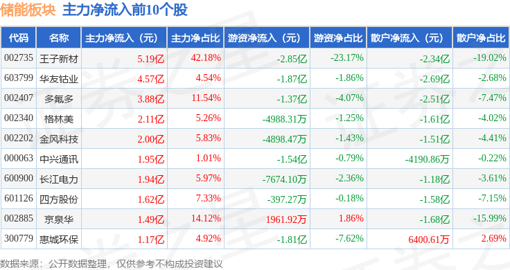 从资金流向上来看,当日储能板块主力资金净流出67.78亿元,游资资金净流出9653.76万元,散户资金净流入68.74亿元。储能板块个股资金流向见下表: