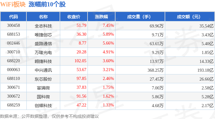 证券之星消息,10月13日WiFi板块较上一交易日上涨1.57%,全志科技领涨。当日上证指数报收于3889.5,下跌0.19%。深证成指报收于13231.47,下跌0.93%。WiFi板块个股涨跌见下表: