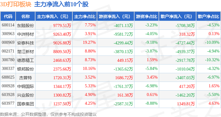 从资金流向上来看,当日3D打印板块主力资金净流出6.79亿元,游资资金净流出2.67亿元,散户资金净流入9.45亿元。3D打印板块个股资金流向见下表:
