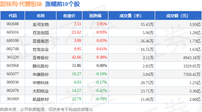 证券之星消息,10月13日甜味剂/代糖板块较上一交易日下跌0.98%,圣泉集团领跌。当日上证指数报收于3889.5,下跌0.19%。深证成指报收于13231.47,下跌0.93%。甜味剂/代糖板块个股涨跌见下表:
